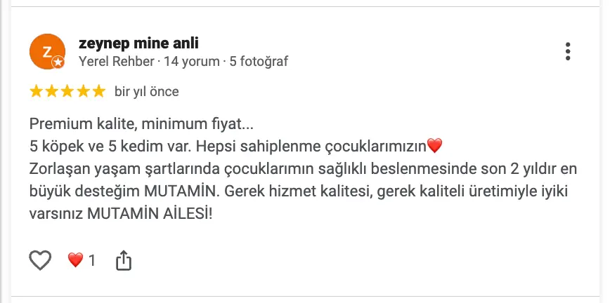 Premium kalite, minimum fiyat...5 köpek ve 5 kedim var. Hepsi sahiplenme çocuklarımızın❤️Zorlaşan yaşam şartlarında çocuklarımın sağlıklı beslenmesinde son 2 yıldır en büyük desteğim MUTAMİN. Gerek hizmet kalitesi, gerek kaliteli üretimiyle iyiki varsınız MUTAMİN AİLESİ!
