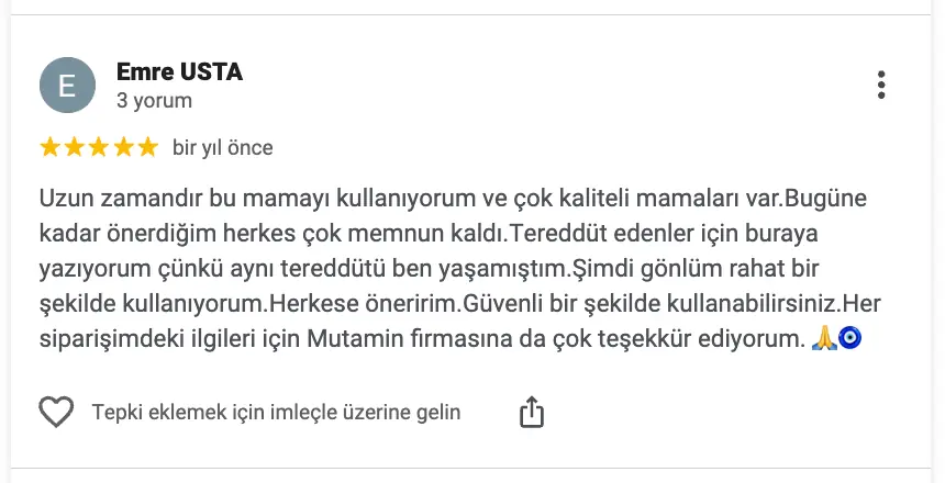 Uzun zamandır bu mamayı kullanıyorum ve çok kaliteli mamaları var.Bugüne kadar önerdiğim herkes çok memnun kaldı.Tereddüt edenler için buraya yazıyorum çünkü aynı tereddütü ben yaşamıştım.Şimdi gönlüm rahat bir şekilde kullanıyorum.Herkese öneririm.Güvenli bir şekilde kullanabilirsiniz.Her siparişimdeki ilgileri için Mutamin firmasına da çok teşekkür ediyorum.
